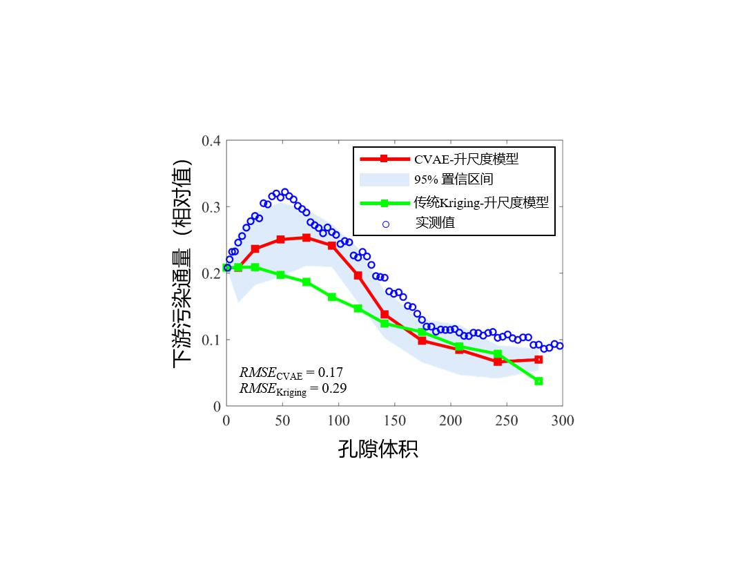 为解决上述问题,公司吴吉春教授团队与美国斯坦福大学、美国桑迪亚国家实验室、夏威夷大学、旧金山大学等国外单位学者合作,基于深度学习技术建立了一套精细刻画DNAPL污染源区结构&精准预测DNAPL污染通量的方法框架。该框架包含两个主要步骤:(1)基于卷积变分自编码器(Convolutional Variational Autoencoder, CVAE)来学习DNAPL的复杂三维空间模式,并给出符合多相流渗流机制的先验模型(物理性先验信息):仅凭少量观测数据即可较好刻画污染源区结构;(2)根据推估所得污染源区结构,采用基于物理过程的升尺度模型方法来描述DNAPL的非线性溶解过程,从而精准预测污染通量的复杂多阶段变化。