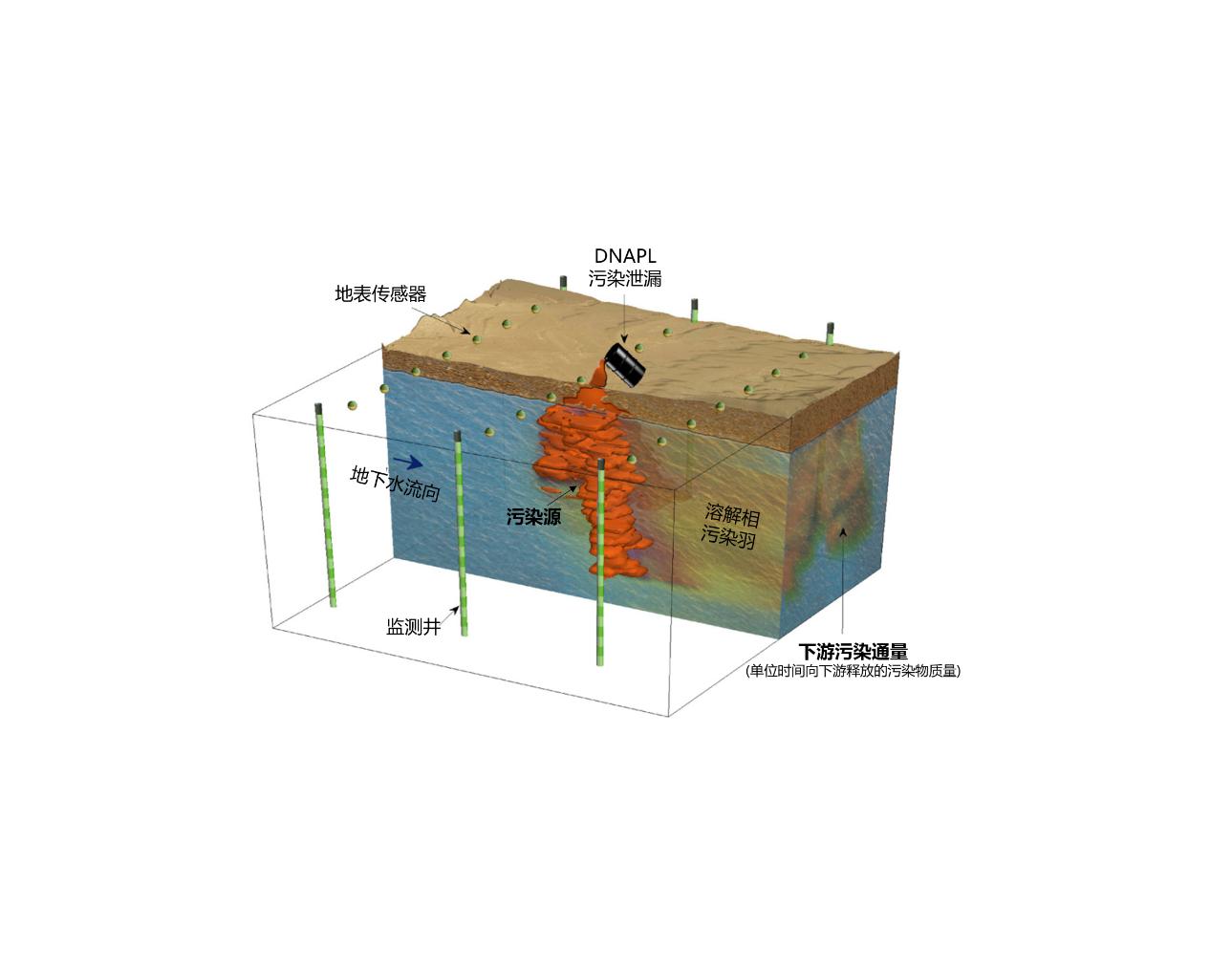 图1. DNAPL污染源区与下游污染通量示意图