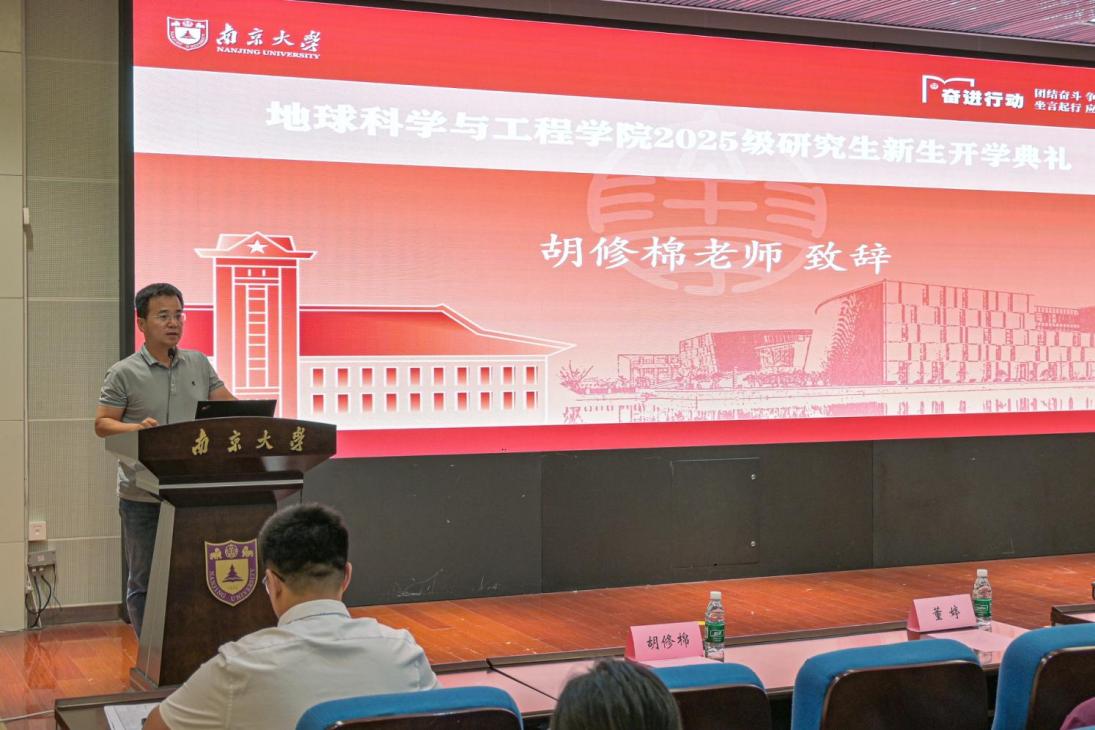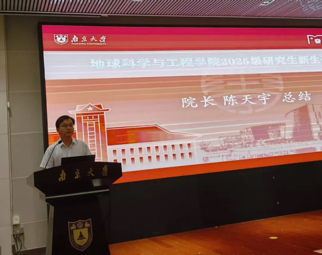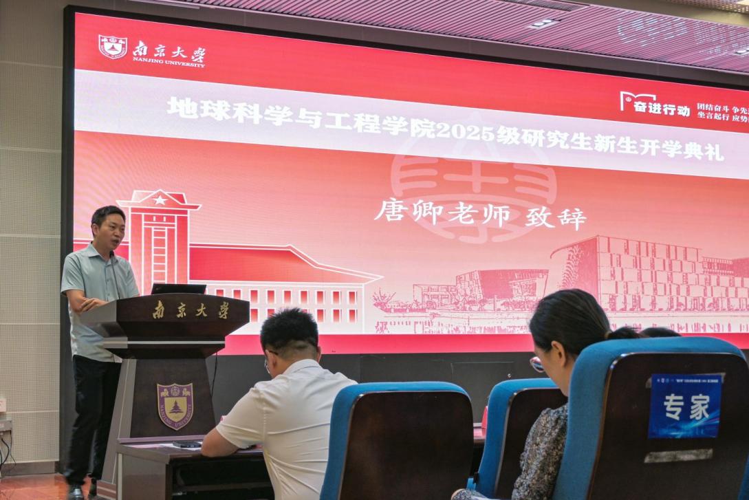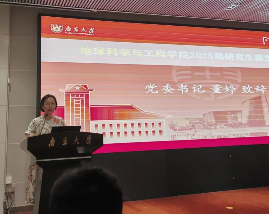 董婷书记代表学院向2025级全体新生表示热烈的欢迎与诚挚的祝贺。她指出,在南大地科院度过的岁月,将成为同学们充实而珍贵的成长时光。围绕未来学习与发展,她对同学们提出三点希望:一是要树立远大理想,明确奋斗方向;二是要培养良好的科研价值观,恪守学术规范、弘扬科学家精神;三是学会在集体中成长,积极与师生交流,找准自身定位,主动服务集体。最后,她祝愿所有新生在南大地科院学有所成、不断进步,拥抱光明的前程。