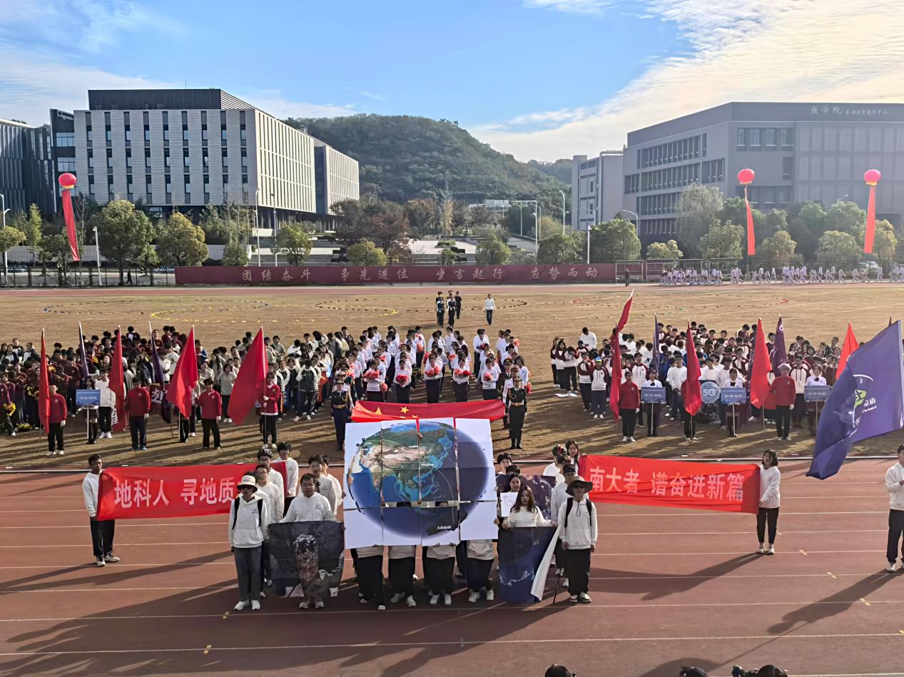 地科院学子们迈着矫健的步伐,带着青春的活力齐部进场。他们展示了地科院特色的全球科考项目,并拼出了一幅完整的中国地图,展现出地学人运动和探索时的拼搏精神。
