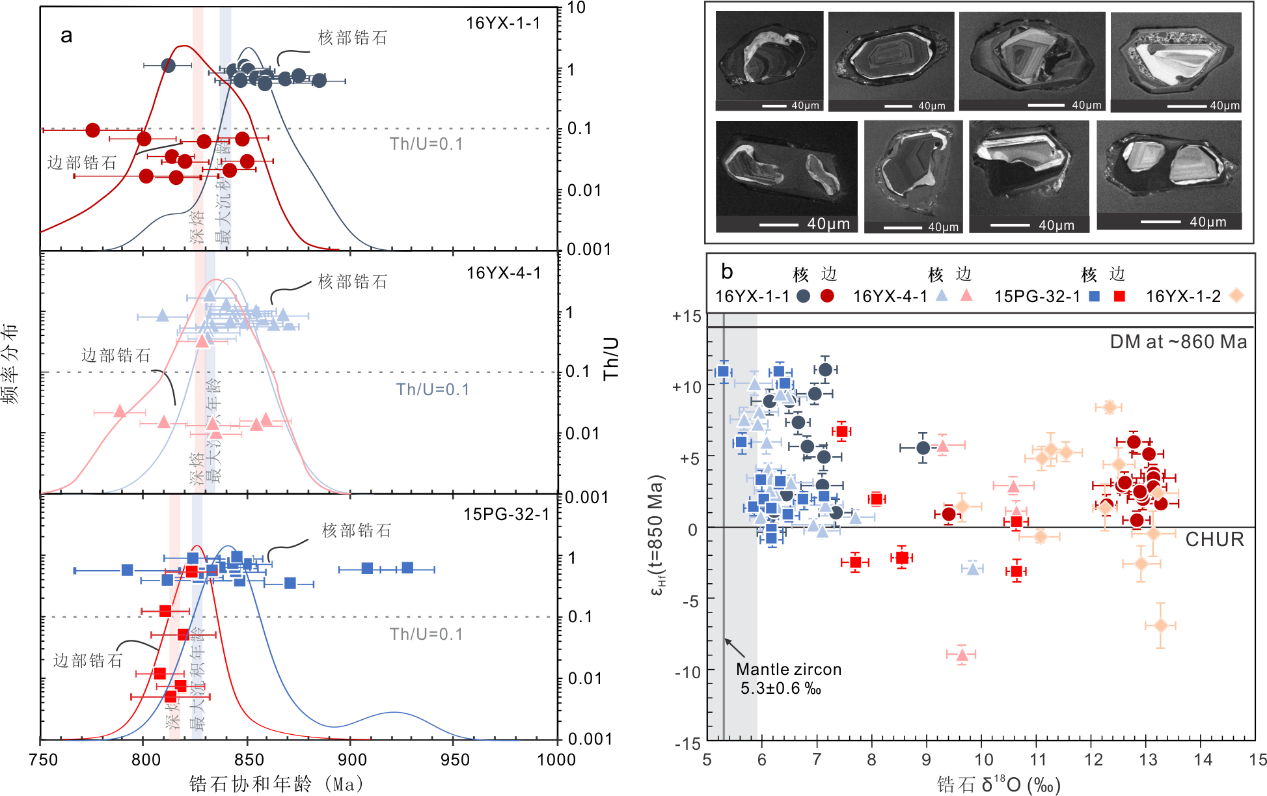 混合岩中的锆石大多具有明显的核边结构。核部的锆石受深熔反应影响而形态多样、大小不一,多呈港湾状、短柱状、粒状和自形六边体等,长轴长度为20–120 μm;其韵律环带明显,Th/U比值>0.3,显示出岩浆结晶成因;年龄主要集中在870–830 Ma(少量~930 Ma)(图1a),指示该混合岩的原岩是一个接受近源碎屑的沉积岩,其年龄代表了沉积岩沉积作用的最大年龄。环绕于核部锆石生长的边部锆石形态以圆环状为主且其宽度多小于50 μm,未发育环带,Th/U比多<0.1,对应其形成于深熔环境;边部的年龄主体上介于860–815 Ma之间(图1a),可用来指示深熔年龄。值得指出的是,边部的年龄与核部的年龄非常接近。进一步通过计算,确定这套混合岩从其原岩沉积岩接受剥蚀开始沉积到埋藏到深部发生深熔,这样一个过程发生在非常短(小于10个百万年)的时间范围内。进一步的锆石离子探针原位Hf和O同位素分析结果表明,核部εHf(t=850 Ma)的值介于–3到+13之间,大多都表现为正值,而δ18O值(5.3–7.4‰)接近或稍高于地幔值(图1b)。这表明它们的沉积物源区应主体来源于新生的大陆弧地壳物质。而边部锆石具有明显高的δ18O值(9.3–13.4 ‰)(图1b),指示了沉积物在埋藏前经历过低温水-岩反应过程。