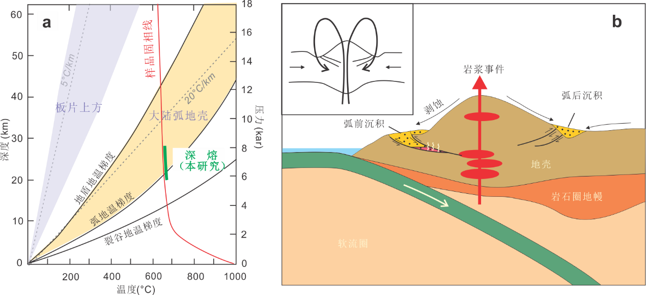 混合岩中常见呈串珠状分布的石榴子石,是深熔作用的产物。混合岩具有强过铝特征,且地球化学特征与典型弧前盆地沉积岩相似。矿物相平衡模拟(封闭体系)结果显示,深熔作用发生于~670℃和5.9–8.1 kbar的温压条件,对应的地温梯度显著热于板片上方(P/T ≤ 34℃/kbar),但与大陆弧地壳的热梯度相符合(图2)。