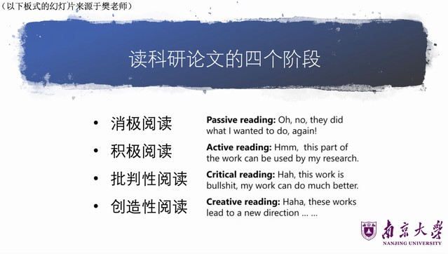 彭英鋆学长结合自身两年半的系统科研训练,深刻阐述了文献阅读在科研全流程中的核心地位。他首次清晰勾勒出文献阅读的进阶路径——从被动接收信息的“消极阅读”,最终迈向能提出新思路的“创造性阅读”。现场,他无私分享了速读、精读、研读的三类具体方法,并推荐了高效的文献检索工具。更难得的是,他坦诚剖析了科研途中曾遇到的挑战,如专业知识储备不足等问题,其真诚的分享赢得了同学们的深深共鸣。