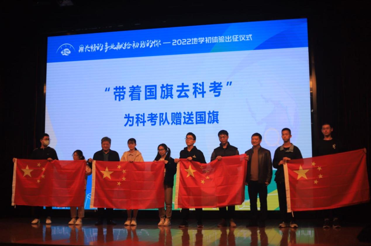 参加地学初体验的同学们离不开前辈的嘱托,更肩负着国家的嘱托。为了践行学院“带着国旗去科考”的传统,王唯和朱国荣为四条路线的员工代表赠送四面国旗。