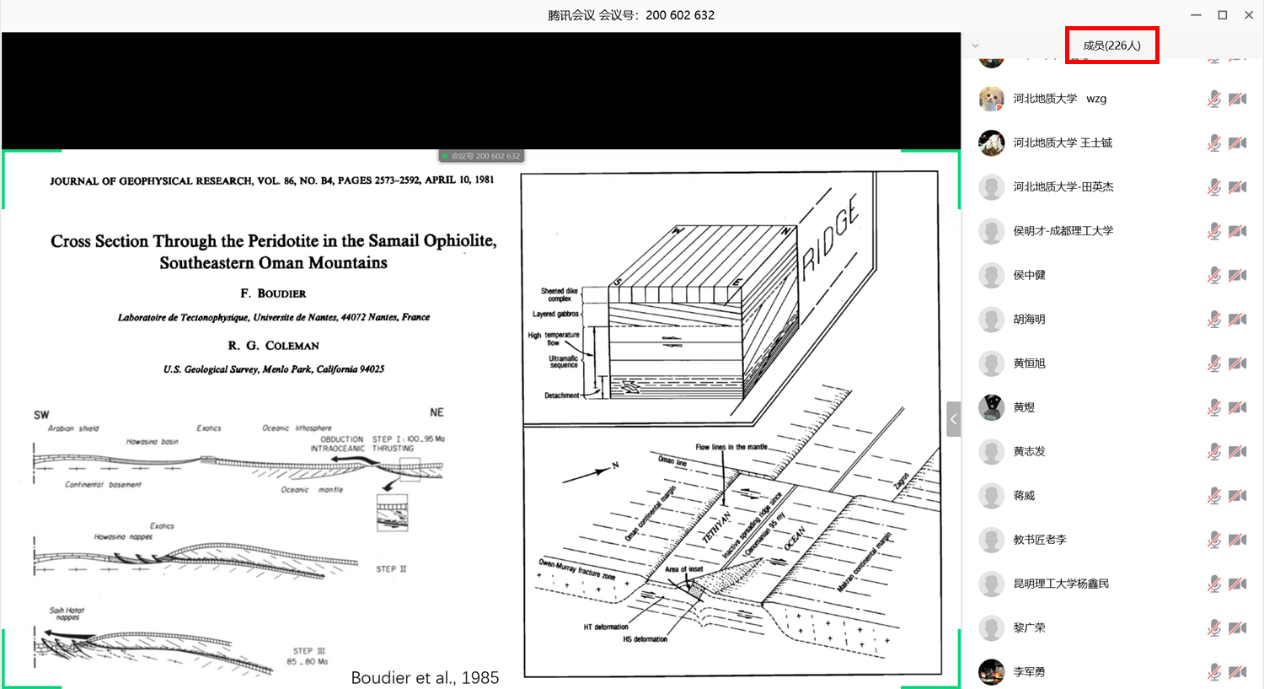 来自全国30余家单位的226位学者正在线上参与“阿曼蛇绿岩仰冲事件”学术交流会