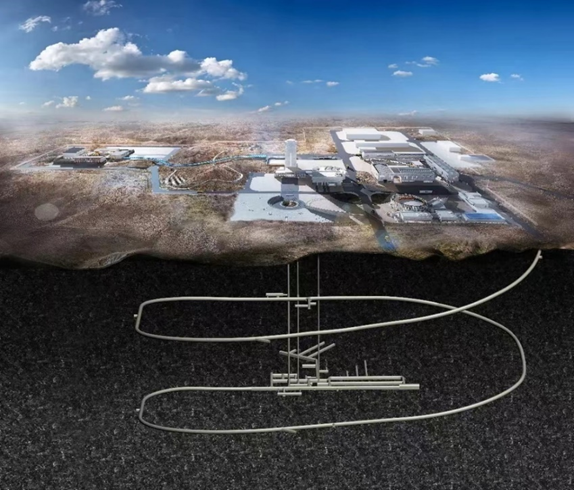 为更直观地感受北山工程的震撼与宏伟规模,我们随工作人员前往工程一线实地考察。在进入地下斜坡道前,大家首先登至工地制高点—北山碑“打卡”,并俯瞰整个工区,王驹现场讲解工程整体布局。山顶围栏上“只有荒芜的戈壁,没有荒芜的人生”的标语令人肃然起敬,彰显了科研人员扎根戈壁、矢志奉献的精神风貌。此后,我们乘车沿直径为7米的螺旋斜坡道下行,地下深处传来的“北山1号”TBM(隧道掘进机)的轰鸣声,犹如工程跳动的脉搏,令人深切感受到项目建设的磅礴气势。在螺旋斜坡道花岗岩岩壁前,王驹指着出露的岩体节理/裂隙,详细解释该场址能够被选为高放废物安全处置的关键地质证据——深部围岩节理/裂隙发育稀少,岩体稳定性良好,整体岩体质量较高。与地上露头不同,在地下,我们看到的都是深部的、三维的、未经风化的岩性和构造特征,极大的弥补了我们地上观测的不足。此外,我们还实地考察了高放废物的处置坑。未来,具有潜在危险的高水平放射性废物在存放进存储容器之后,将被永久处置进这个坑中,通过天然屏障和工程屏障等构成的多重屏障体系实现安全隔离与长期处置。