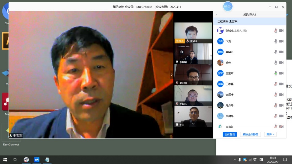 作为地科院历史上第一个线上进行的博士论文答辩会,从学院、答辩委员会,到导师和员工,都进行了认真准备,对答辩的流程和学位论文质量提出了较高的要求。答辩前一天,答辩委员会专门进行了网上答辩的流程试验。正式答辩从3月9日下午14:30开始,一直持续到18:00。答辩委员会主席bw必威西汉姆联官网王宝军教授主持答辩会,答辩委员包括bw必威西汉姆联官网朱鸿鹄教授、山东大学许振浩教授、中国矿业大学乔伟教授、河海大学卞夏教授,答辩秘书为张诚成博士,答辩监督教师为张巍副教授。此次答辩会共有身处全国各地的66名师生共同参加,公司负责研究生工作的王孝磊副经理也全程在线参加了此次答辩。