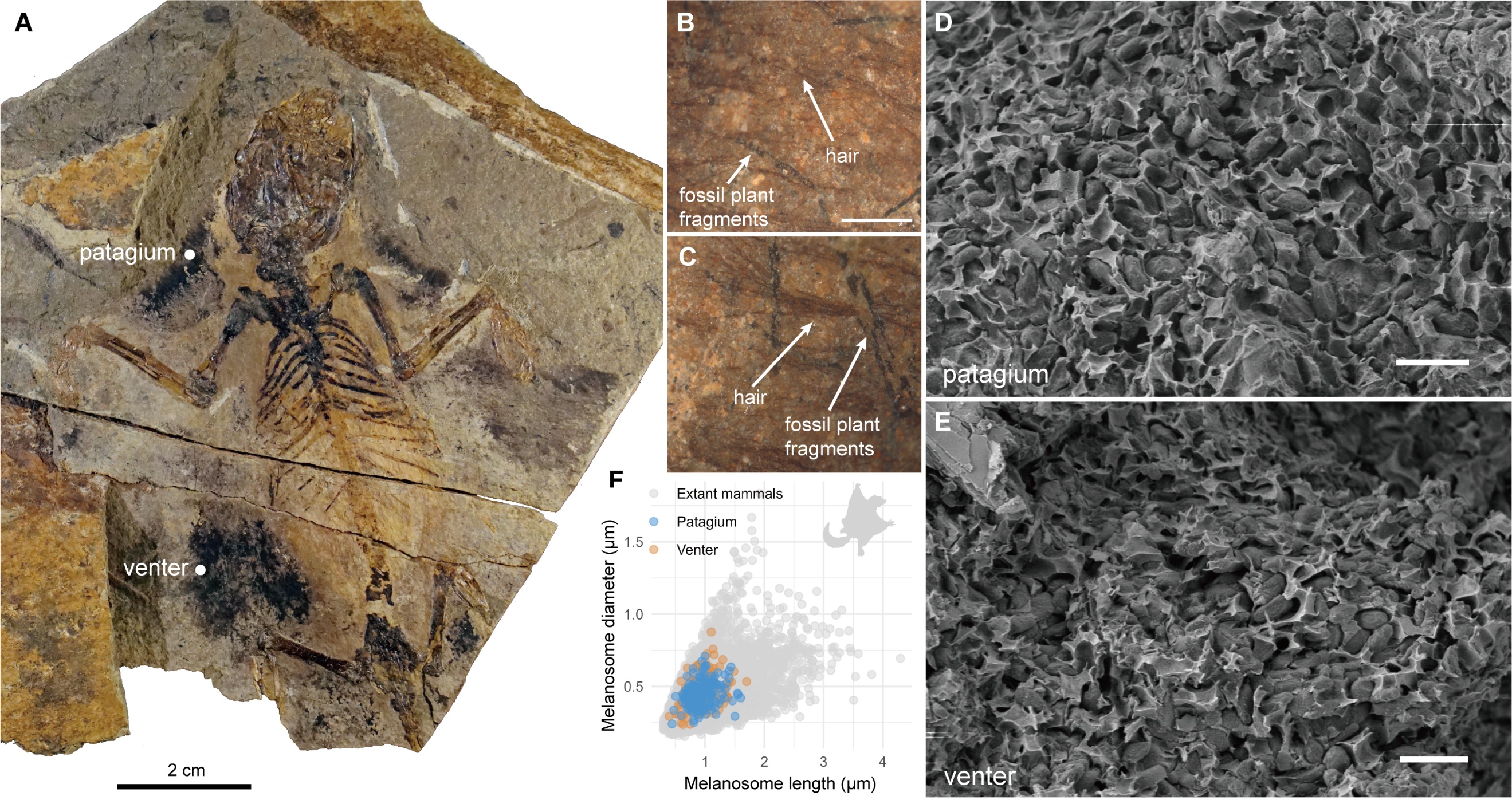 图3:双钵翔齿兽(Vilevolodon diplomylos)化石毛发结构与黑素体几何形态