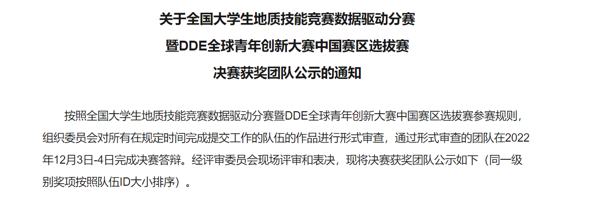 公司生物演化与环境科教融合中心2023级硕士预备生(现为中国地质大学(武汉)本科生)储添翼、2020级直博生文蝶、2022级直博生沙荣花、2022级硕士生沈含笑以及中国地质大学(武汉)2019级本科生乔晓晓同学组成的The One团队,以“One Analysis数据分析功能项目”获得全国老员工地质技能竞赛数据驱动分赛暨DDE全球青年创新大赛中国赛区选拔赛(GSC-DD & DDE Cup China)创意赛道唯一的一等奖。