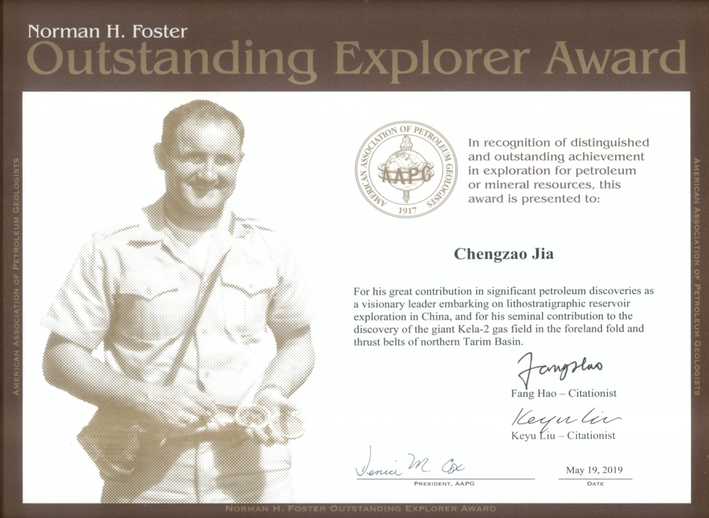 2019年5月19-22日,美国石油地质学家协会(AAPG)年会在美国德克萨斯州圣安东尼奥举行。中国科学院院士贾承造先生获得了著名的诺曼 H.福斯特杰出勘探家奖(Norman H.Foster Outstanding Explorer Award),是亚太地区第一位获此殊荣的勘探家。