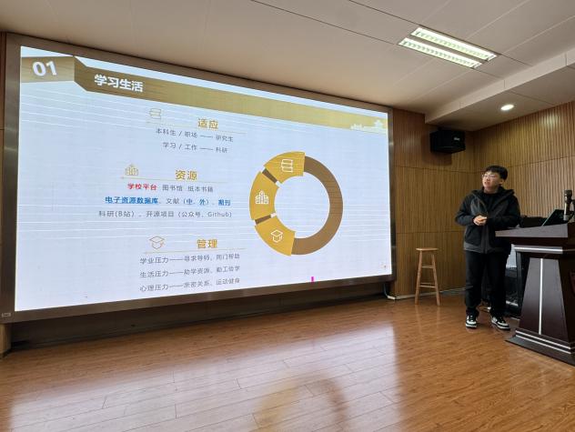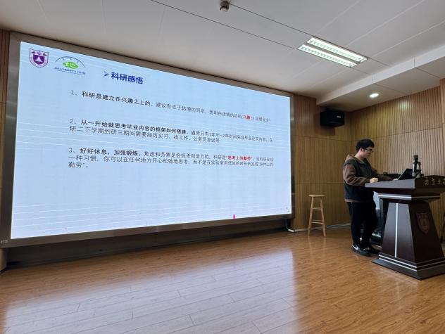 会上还邀请到了优秀的高年级研究生从科研、学业、就业等方面为同学们传经送宝,并为同学们做了精彩的学术汇报。2023级博士研究生孟胤全梳理了自身的科研历程和学习过程中遇到的挫折,以自己的亲身经历来分享自己的经验和体会,鼓励同学们不畏挫折困难;2022级硕士研究生徐朝晖作“基于深度学习与数据同化方法的裂隙网络反演研究”报告,为同学们呈现了一场精彩的科研汇报,同时也把自己对科研、生活以及就业方面的感悟分享给大家,建议同学们多和导师进行沟通交流,鼓励同学们勇于试错、早日确立方向并夯实基础;2023级博士研究生邓清文汇报了自身在水文序列非平稳性方向的科研成果,从“汲取、提问、探索、输出”的思路展开研究,并给出同学们关于就业以及科研和学习的技巧、方法。由三位老师依次向分享经验的高年级同学颁发礼品并合影留念。