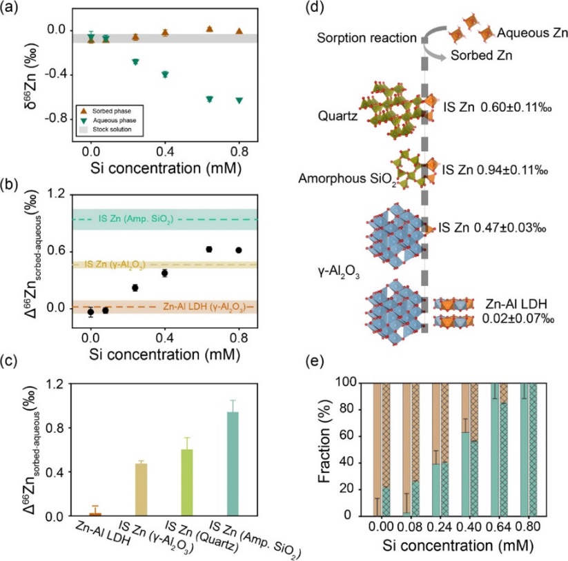 为了解决这一难题,公司李伟教授团队创新性地利用金属稳定同位素的分馏差异成功示踪了锌离子在不同矿物表面吸附位点的结合模式。与同步辐射研究结果相反,不同表面吸附过程产生的锌同位素平衡分馏却存在较大差异,表面沉淀态的锌可产生0.02 ± 0.07‰的分馏,与氧化铝表面以内圈配位结合态锌可以产生0.47 ± 0.03‰的分馏,与石英和无定型二氧化硅表面结合的锌可分别产生0.60和0.94‰的分馏(图2)。基于同位素平衡分馏的质量守恒原理,我们可以定量算出复合体系各种含锌物种的形态。此前,金属稳定同位素在表生环境领域主要用于宏观尺度的源解析,我们的工作将稳定同位素的应用进一步推广到了微观尺度的地球化学反应过程示踪,为研究复杂系统的元素生物地球化学循环提供新思路。