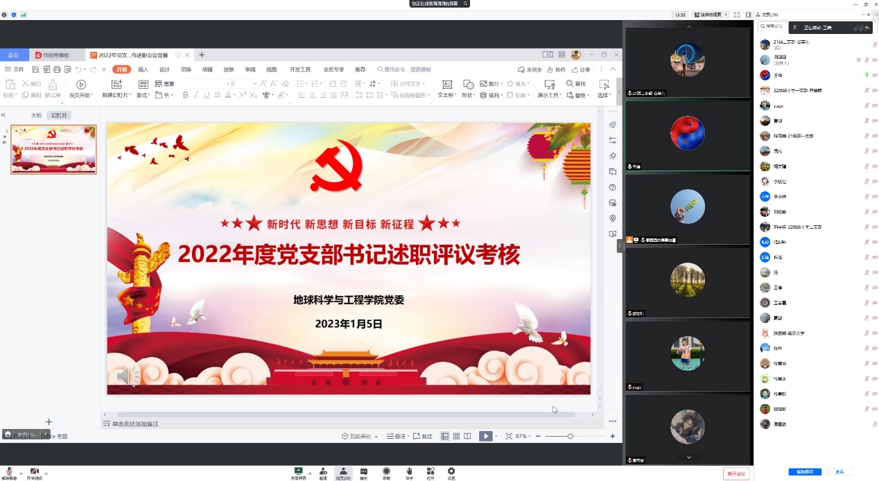 为深入学习贯彻习近平新时代中国特色社会主义思想和党的二十大精神,全面贯彻落实新时代党的建设总要求和党的组织路线,持续推进全面从严治党向基层延伸,长效推动基层党组织建设全面进步,2023年1月5日,地球科学与工程公司党委召开2022年度党支部书记抓党建工作述职评议会,会议以线上方式举行。全体党支部书记、党委委员、专职组织员等参与此次评议会,会议由公司党委王唯书记主持。