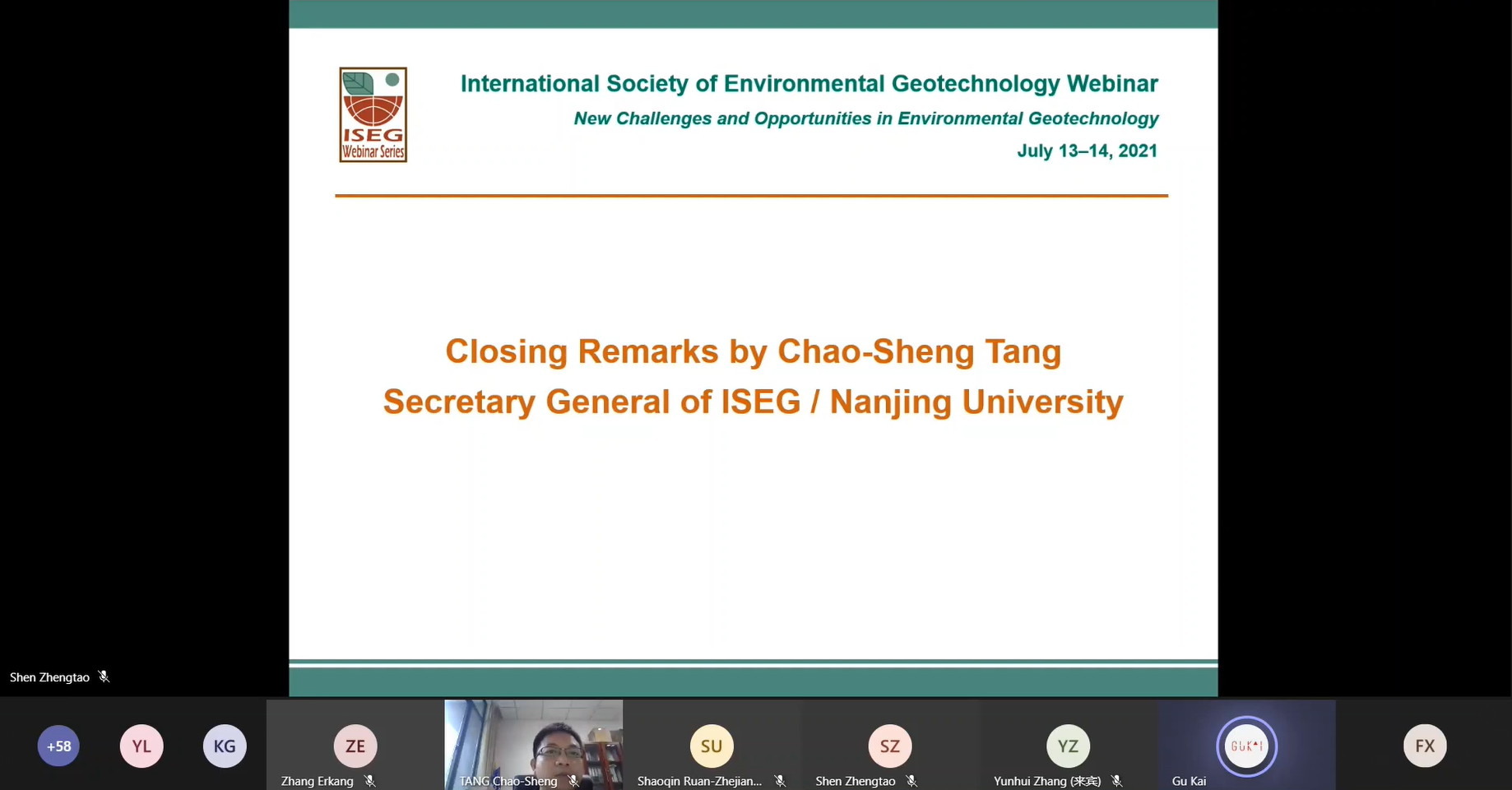最后,大会秘书长唐朝生教授对本次会议进行了总结。本次网络研讨会有效地促进了环境岩土工程领域专家学者和从业者的交流与合作,取得了积极的成果。在新形势下,环境岩土工程工作者面临的机遇和挑战并存,大有可为,未来ISEG将组织更多的活动促进交流与合作。他感谢所有报告人和来宾的参与和组委会的辛勤工作。