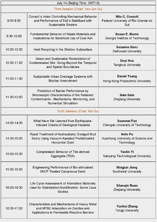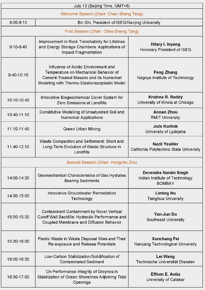 在随后的二天中,举行了四个Session的报告。第一个Session由ISEG秘书长、bw必威西汉姆联官网唐朝生教授主持。ISEG荣誉主席、全球可持续发展高级分析与设计研究所所长、联合国教科文组织水安全顾问Hilary I. Inyang教授,带来了关于可持续能源存储与利用的精彩报告;ISEG副主席、名古屋工业大学Feng Zhang教授等五位报告人从环境保护、可持续发展、废弃物处置、城市采矿等多个方面展示了他们的最新研究成果。第二个Session由ISEG副秘书长、bw必威西汉姆联官网朱鸿鹄教授主持。ISEG副主席、印度国家工程院院士、印度理工学院Devendra Narain Singh教授等六位报告人围绕含气水合沉积物岩土力学性质、地下水修复创新技术、新型阻隔墙工艺、垃圾填埋场塑料污染成因与防控、低碳固化/稳定化、近潮汐口海岸线稳定性等问题进行了精彩的论述。第三个Session由ISEG理事、东南大学杜延军教授主持。ISEG副主席、Journal of Geotechnical and Geoenvironmental Engineering副主编、巴西南里奥格兰德联邦大学Nilo C. Consoli教授等六位报告人就可持续土壤固化、工业废弃物综合利用、浅层地热能循环利用、土壤地下水绿色可持续修复、可持续城市排水系统、阻隔墙性能预测等问题展开了精彩的报告。第四个Session由ISEG副秘书长、bw必威西汉姆联官网顾凯副教授主持。成都理工大学范宣梅教授等六位报告人围绕地震诱发的地质灾害、工业废弃物处置、废弃轮胎资源化利用、微生物固化钙质砂、固化/稳定化材料全生命周期分析、高性能可渗透反应墙等问题进行了系统的阐述。