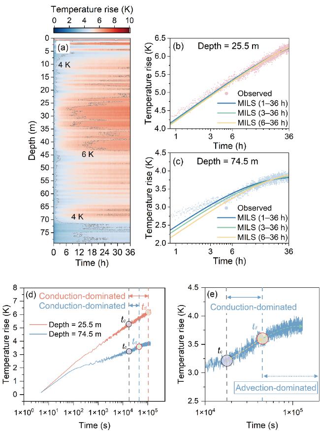 图1 基于ATRT的地下水流速估算.(a)地层的温度响应;(b)&(c)单点温度测试值与理论值对比;(d)&(e)渗流影响下单点温度响应过程分析
