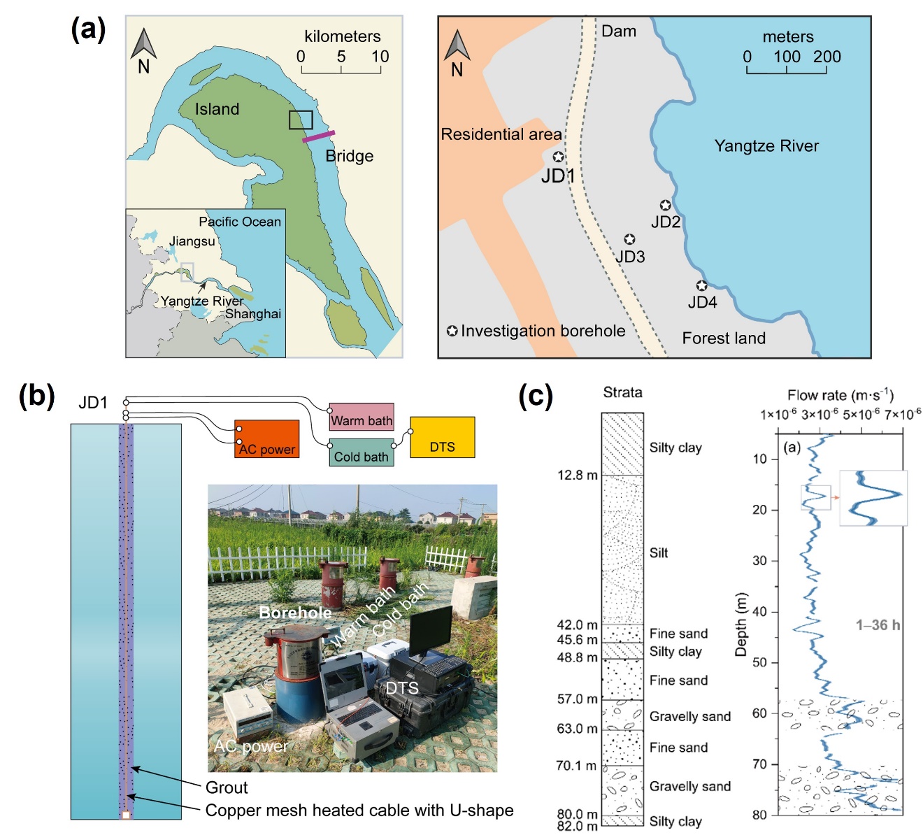 图2 (a)镇江指南村“长江第一崩岸”渗流场监测;(b)测试示意图及系统;(c)钻孔深度范围内地层分布及渗流分布