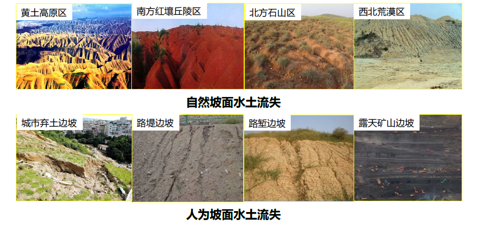 受全球气候变化影响,强降雨等各种极端气候事件频发,导致水土流失问题日益严峻。此外,随着我国经济的快速发展,基础设施和大型工程建设如火如荼,各种高强度的机械开挖破坏原有生态系统和地表植被,形成大量裸露的土质边坡,使其直接暴露于降雨侵蚀之下,引发一系列新的水土流失问题(图1)。目前我国水土流失面积高达295km2,占国土面积的30.7%,年均土壤流失量超过50亿吨。严重的水土流水不仅导致土壤中细颗粒和营养成分的大量流失,造成土地退化,农作物减产,还会诱发滑坡、泥石流等自然灾害,严重威胁生态环境及人民生命财产安全。面对日益严峻的水土流失问题,传统的水土流失防治措施(植被、材料和工程措施)难以同时满足时效、生态、环保和低成本要求,亟需通过技术创新寻求新型的侵蚀调控措施。
