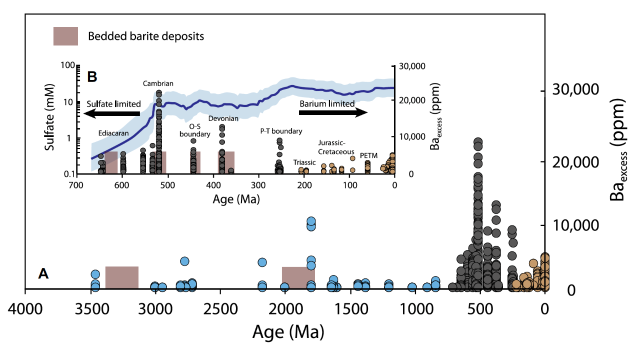 在对以上现象观察和分析的基础上,bw必威西汉姆联官网魏广祎助理研究员、凌洪飞教授及国内外合作者通过统计整个地质历史时期海相泥页岩的Baexcess含量,并与现代沉积物进行对比,用以限定不同时期海洋溶解Ba的浓度变化,进而重建长时间尺度下海洋整体氧化还原变化。由于早期海水硫酸盐浓度极低,全球范围内海样重晶石沉淀极少,使得溶解Ba大量积累。随着海洋氧化程度的增加,海水中硫酸盐浓度的逐步上升,造成海水重晶石饱和度提高,海洋沉淀重晶石增加,但是随着全球范围内海洋重晶石的大量沉淀,海水溶解Ba浓度逐渐下降,当其浓度下降至接近现代海水水平时,即使远洋海水具有极高的硫酸盐浓度也无法造成重晶石的大量沉淀。表现在泥页岩Baexcess含量变化则为(图2),(1)新元古代晚期之前,由于海水硫酸盐浓度极低,无法造成泥页岩中Baexcess的显著富集;(2)埃迪卡拉纪晚期至整个古生代均存在Baexcess的明显富集,代表这一时间段海水硫酸盐浓度显著提高,同时海水溶解Ba浓度仍然保持在较高水平;(3)中生代和新生代沉积物中缺少Baexcess显著富集现象,说明这一时期海洋溶解Ba浓度已经降到很低的水平,可能与现代海洋相当,同时也与海水硫酸盐浓度进一步提高相对应。以上现象可以得出以下主要结论: (1) 新元古代晚期以来全球海洋氧化程度明显提高,但整个古生代海洋氧化程度显著低于现代海洋水平;(2) 持续的,“可恢复的”氧化海洋的建立应从中生代开始;(3) 可以推想长时间尺度下全球海洋的氧化模式为:持续缺氧—缺氧为主体,发生间歇性氧化事件—持续氧化,发生间歇性缺氧事件—持续氧化。