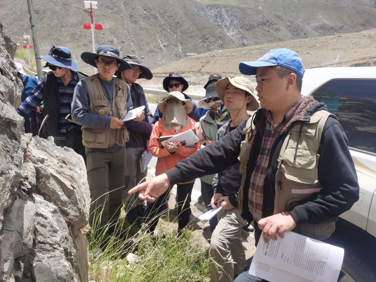野外观察前胡修棉教授(左三)讲解当天路线和主要地质内容