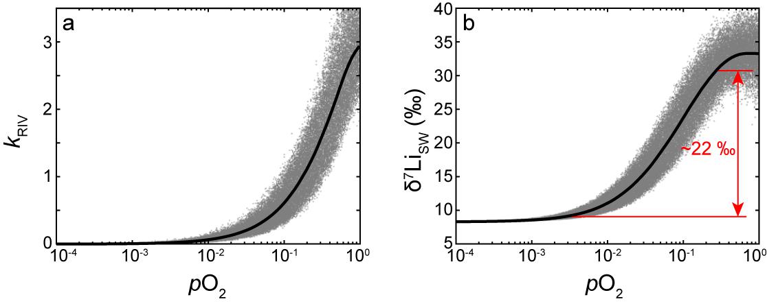 图2大陆风化通量(kRIV)和海水δ7Li对大气氧含量的响应