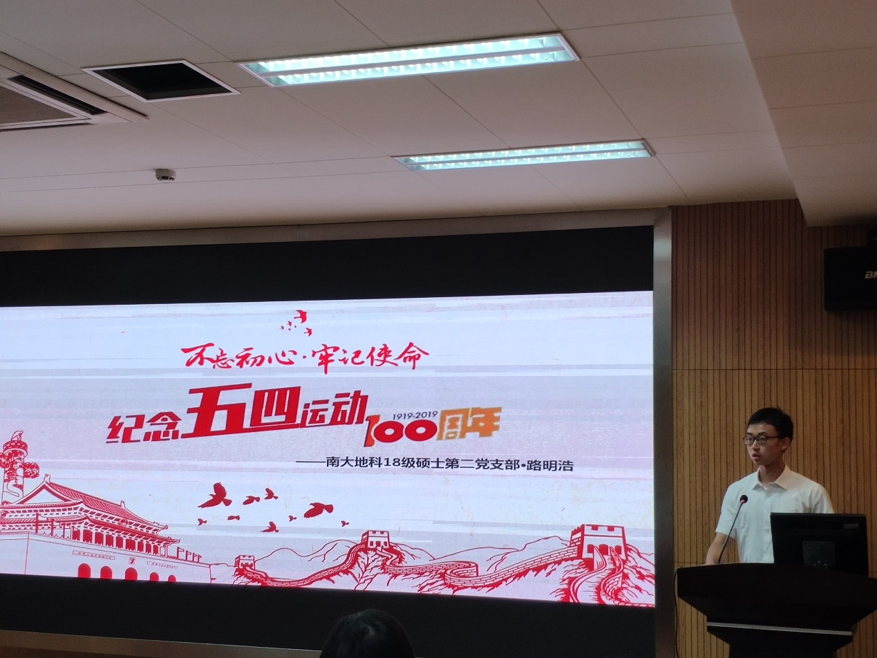 第六位演讲者是来自2018级硕士生二支部的路明浩同学,他的微党课主题是“纪念五四运动100周年”。他以五四运动为背景谈论如何在新时代背景下弘扬五四精神,并以南大员工袁辉为实例讲述了如何实现“建设第一个南大”的目标。