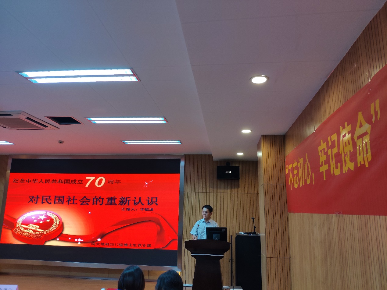 第十二位演讲者是来自2017级博士党支部的辛韫潇同学,他的微党课主题是“对民国社会的认识”。他通过对民国社会的基本介绍,重新深刻认识解放前的落后面貌以及新中国成立的历史意义。