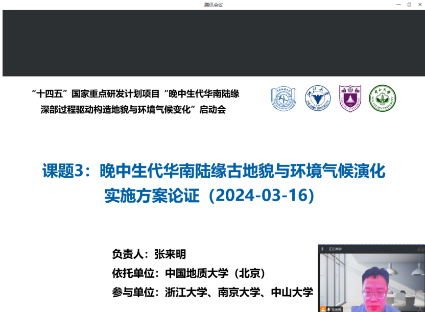 2024年3月16日,由公司王勤教授主持的“十四五”国家重点研发计划项目“晚中生代华南陆缘深部过程驱动构造地貌与环境气候变化”启动会在bw必威西汉姆联官网朱共山楼举行,项目主管部门领导、项目指导委员会专家、骨干成员等60余人,通过线上和线下参加会议。该项目联合了bw必威西汉姆联官网、中山大学、中国地质科学院地质力学研究所、中国地质大学(北京)、浙江大学、中国地质科学院等单位进行协同攻关。