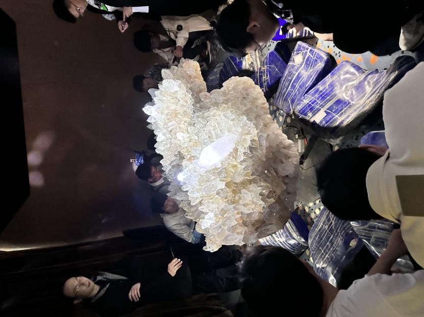 为确保每位同学都能近距离观察到奇珍异宝,领略大自然的鬼斧神工,同学们分为两队,分别由朱郗和孙国梁两位老师带队讲解。一进入大厅,印入眼帘的是一个巨大的紫水晶晶洞,后面是满墙铺陈的海百合。继续深入大厅内部,里面陈列着异彩纷呈、千奇百怪的矿物,有千姿百态的黄铁矿,色彩缤纷的水晶,“毛茸茸”的石膏等多种多样的矿物展品,一下子吸引了同学们的目光。