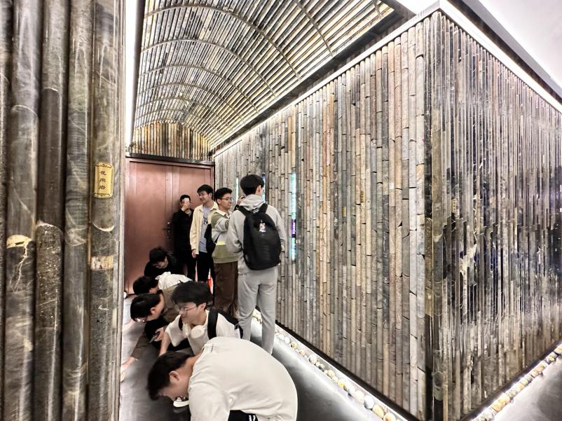 随后,同学们来到了负一层,有数百个不同岩性的钻井岩心构架出一面面岩石墙,进入展厅是琳琅满目的矿物手工艺品,生动再现了古人开采矿山的画面,深刻感受到劳动人民的智慧。此外,同学们还在讲解老师的带领下参观了三层私人珍藏的镇馆之宝———碧玺,碧玺的学名为电气石,因其拥有几乎每种色调不同浓淡的色彩,常被用作宝石。最后,江苏矿物文化交流中心的工作人员还为同学们准备了一份精心的礼物,一块黑色的电气石,留作纪念。