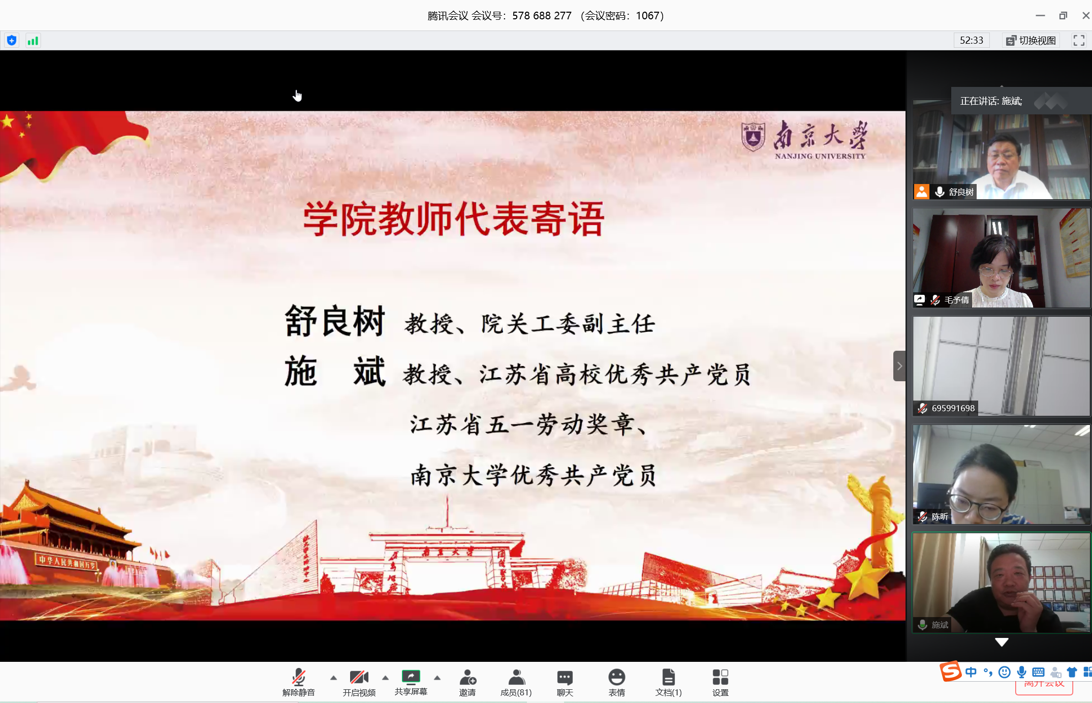 随后,毕业生辅导员为大家带来了真挚的祝福。研究生辅导员汤晓茜老师感谢了支部委员们的辛苦付出和全体党员的自律配合,对党支部三年来的优秀工作与每位党员获得的诸多荣誉表示肯定。她表示,在国际形势复杂的大背景下,更能体会到生命的意义不在于长短而在于价值,希望同学们能够奋斗出自己的人生价值。本科生辅导员陈昕老师对同学们的未来生活提出了三点希望:一是要有恒心,无论什么环境都要坚持下来;二是要有信心,要迎难而上面对困难;三是要有决心,面对抉择要有充分考量。她勉励各位同学发挥“今日我以南大为荣,明日南大以我为荣”的精神,继续在工作岗位上创造价值。