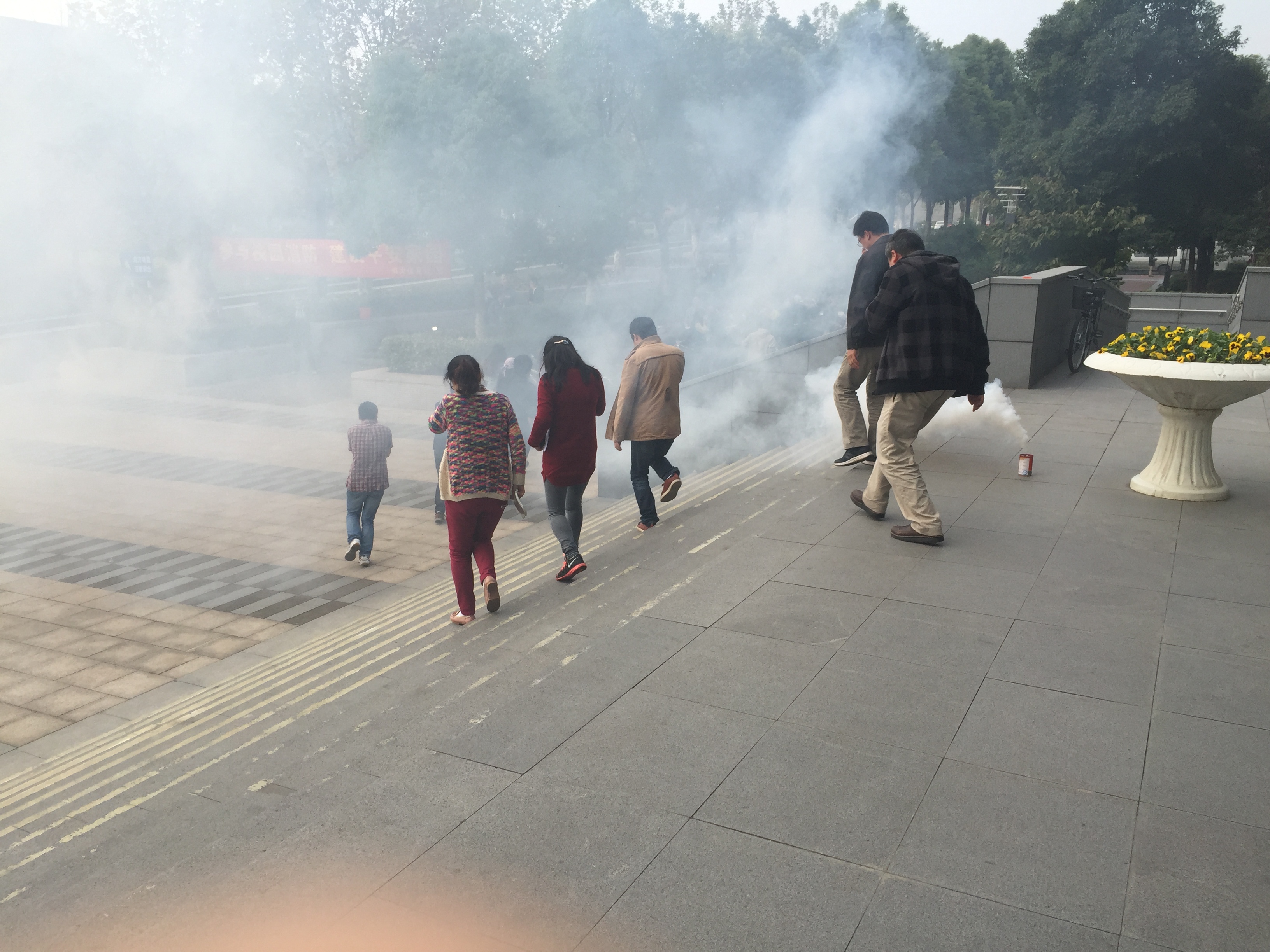 下午3点,演练正式拉开序幕。首先进行火灾疏散演练,只见朱共山大楼前烟雾弥漫,两位同学发现险情,迅速拨打“