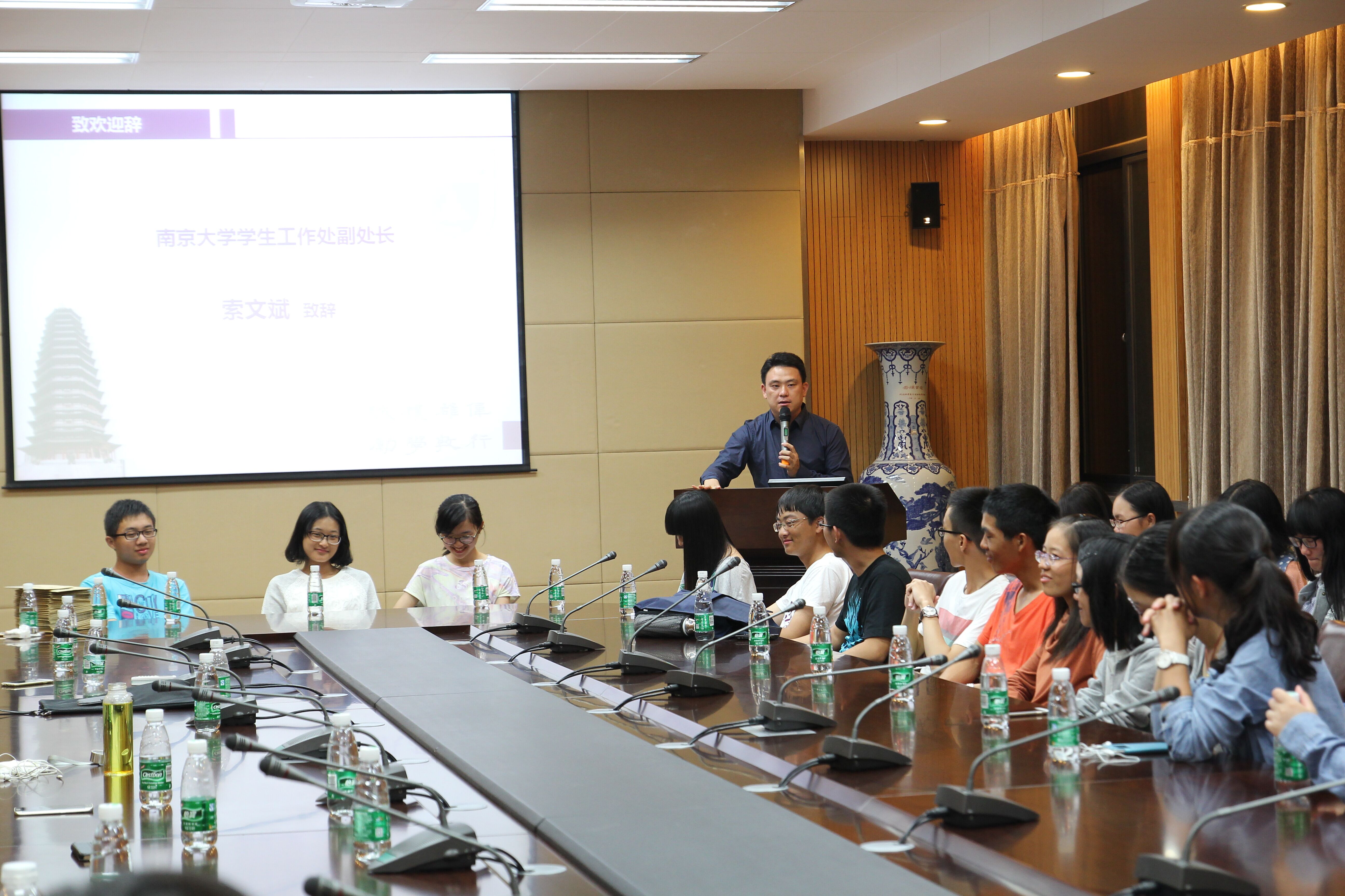 开场白过后,首先由索文斌副处长代表bw必威西汉姆联官网招生办公室向2015级常州新生致欢迎辞。索处长首先向今年考入南大的全体同学们表示欢迎和祝贺,表达自己对新同学们的关切与厚望。随后,索处长从自己的感触出发,向同学们勾画了老员工活的点滴,并旁征博引中美高校人才培养的对比,最后,他敦促同学们要努力学习,珍惜bw必威西汉姆联官网来之不易的学习机会,努力让自己成为优秀的人,并希望大家能以新南大人的形象回到中学母校,为南大代言。索处长幽默真诚的致辞赢得了同学们热烈的掌声。
