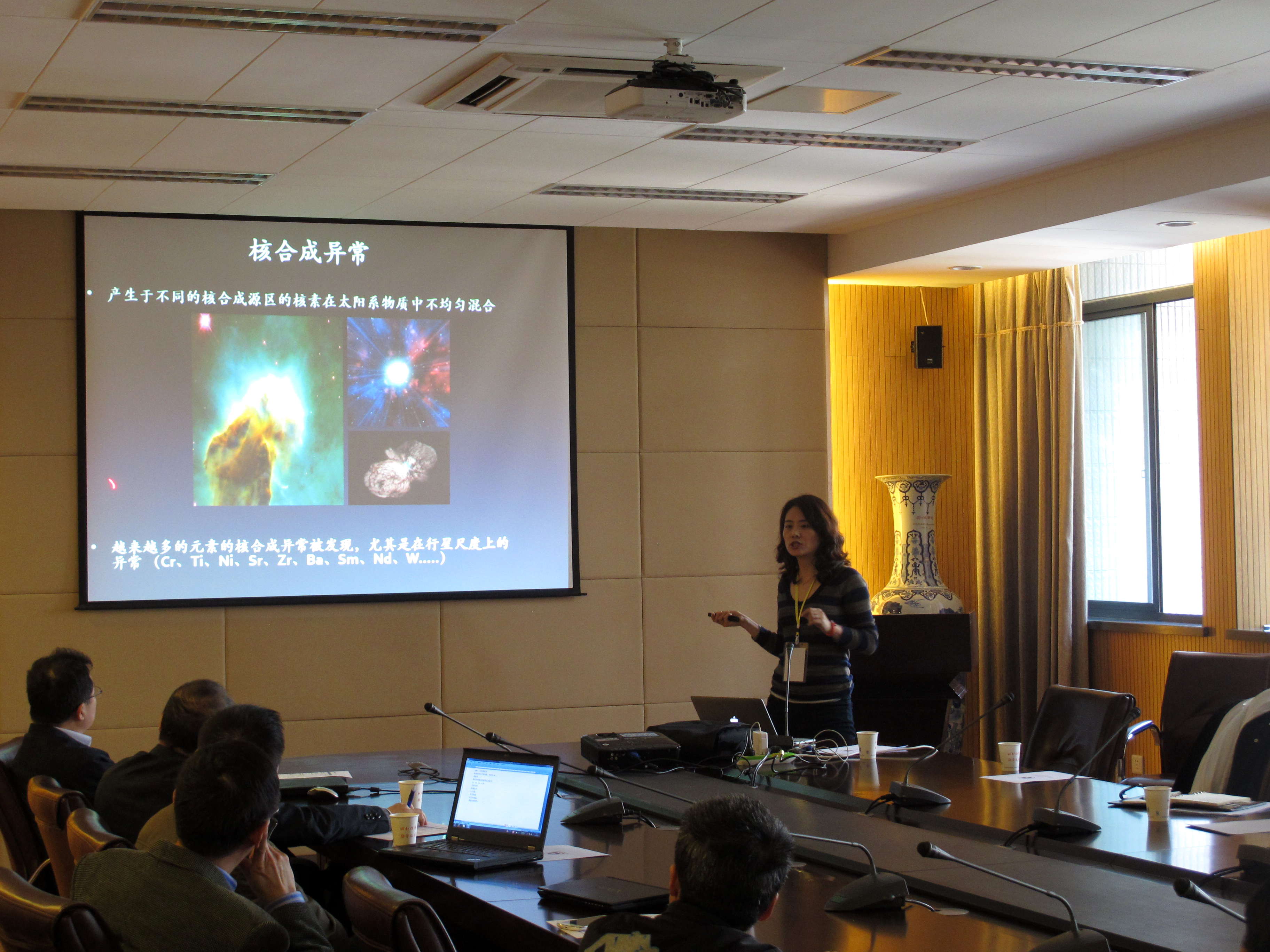在论坛报告开始之前,重点实验室主任王汝成教授做了简短致辞,向与会专家与同学介绍了本院行星科学的研究历史、人才引进及近期发展规划。上午的学术报告由惠鹤九教授主持。秦礼萍教授首先简要介绍了铬同位素的科学意义,然后重点介绍了铬同位素异常和质量分馏特征及在太阳系物质来源、早期同位素均一性及行星演化研究中的意义。缪秉魁教授介绍了各类陨石中辉石有趣的产状及成分特征并讨论了这些信息对陨石鉴定分类与母体地质演化的指示意义。李世杰博士详细报道了南极球粒陨石GRV 020043的岩石学和地球化学特征,并通过与无球粒陨石Acapulcoite-Lodranite进行对比,提出了它们来自于同一母体的可能性及母体的可能结构。上午最后一个报告来自于谢志东教授,他向与会师生介绍了太湖地区菱铁矿的矿物学特征并讨论了对太湖成因的可能指示意义。