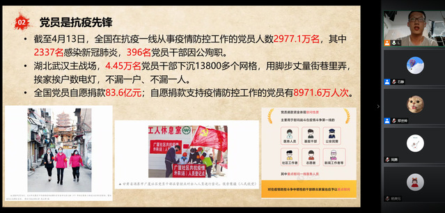 为深入贯彻落实《关于开展基层党组织常态化疫情防控“四个一”行动的工作通知》具体要求,充分发挥党支部战斗堡垒作用和全体党员先锋模范作用,让党旗始终高高飘扬在疫情防控、返校复学、事业发展全过程全方位,2020年6月24日,公司2018级硕士生一支部举行了一次线上主题党日活动。党支部书记李全坤做了以“习总书记金句与中国抗疫之路”为题的专题微党课。随后的组织生活会以“迎党的生日、讲战疫故事、悟初心使命”为主要内容展开,支部党员积极发言,结合战疫说身边故事,讲切身体会。