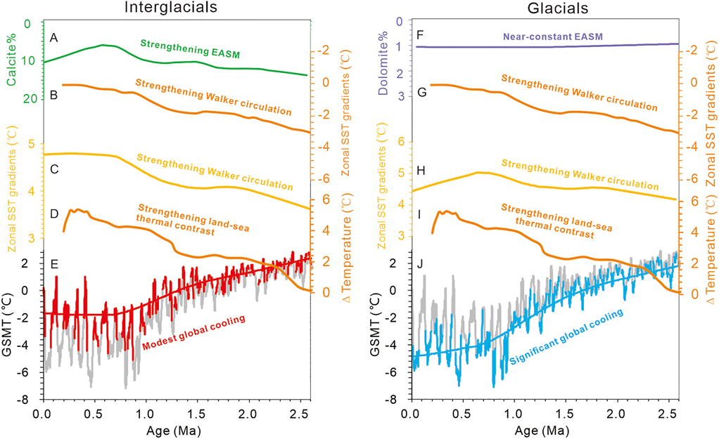 图1 间冰期(左图)和冰期(右图)期间沃克环流和全球变冷对更新世东亚夏季风降水的调控作用。A和F根据方解石和白云石含量分别重建的间冰期和冰期期间东亚夏季风的长期趋势(本研究);B和G显示了从多个海表温度记录中得出的太平洋纬向海表温度梯度;C和H分别说明了间冰期和冰期西太平洋暖池中的ODP1143和东太平洋冷舌中的ODP 846之间的纬向海表温度梯度;D和I显示黄土高原和热带海洋之间的陆海热对比;E和J描绘了全球平均地表温度异常(ΔGMST),E中红线表示的间冰期,J中蓝线表示的冰期。