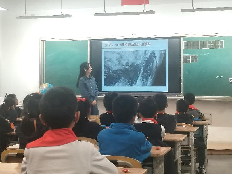 首先由严子妮向同学们介绍火山的相关知识。她以2022年初的汤加火山爆发和海啸的震撼画面引入主题,配合丰富详实的实物照片,由浅入深,依次介绍了火山喷发物质、火山分类、火山危害等内容。在讲解过程通过提问互动,极大地调动了同学们的积极性。