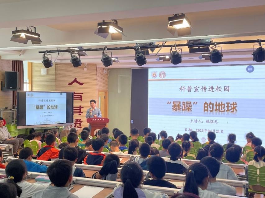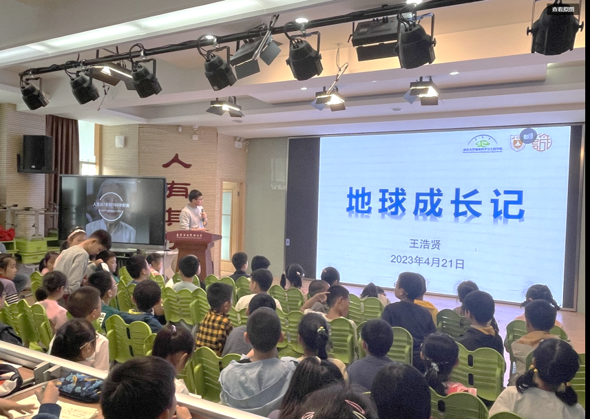 4月21日下午,张猛龙、王浩贤、李雯雯来到南京成贤街小学,为三年级全体同学进行题为“地球成长记”的地学科普宣讲。