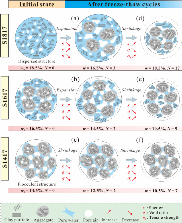 针对上述科学问题,bw必威西汉姆联官网唐朝生教授课题组对具有不同压实含水率及压实干密度的试样进行了多轮开放环境下的冻融循环试验,并先后测试了试样沿干燥路径的抗拉强度、孔隙比及吸力(图2)。研究发现随着冻融循环次数的增加,试样的抗拉强度均呈现先减小后增大的趋势,且转折点通常位于低于初始含水率1.5%-2.0%的位置。这主要归因于试验初期冻融引起的孔隙比增加以及粘聚力和吸力减小等负效应起控制作用,由此导致抗拉强度的减小。而试验后期,随着冻融循环次数的增加和含水率的进一步减小,干燥诱导的土体收缩、粘聚力及吸力增大等积极效应占据主导地位,由此导致抗拉强度的增大。在反复的冻融过程中,初始压实含水率越大的试样表现出更大的膨胀势及收缩势。冻融循环初期,相比干侧压实样,在最优含水率及其湿侧压实的试样受冻胀作用显著,具有更大的孔隙比和更小的吸力及抗拉强度,而在冻融循环后期发生更强烈的收缩,呈现更小的孔隙比和更大的抗拉强度。除此以外,试样的抗拉强度始终随压实干密度的增大而增大,该趋势不受冻融循环及干燥过程的影响。该研究从以团聚体、团聚体间孔隙及水桥为特征的微观结构的角度揭示了冻融循环及干燥过程耦合作用下土体抗拉强度的演化机理(图3)。研究成果对季节性冻土区的基础设施建设具有指导意义,即在最优含水率的干侧和最大干密度下压实土能够显著提升土体的抗冻融性能。