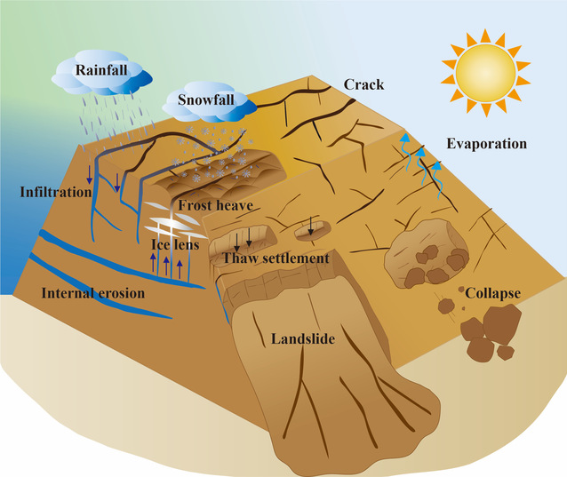 裂隙的存在会显著弱化土体的工程性质,从而对大坝、斜坡、渠道、公路和铁路路堤等基础设施的稳定性构成威胁(图1)。鉴于抗拉强度是决定土体张拉裂隙萌生和扩展的重要力学参数,研究土体的拉伸行为及抗拉强度的演化规律有助于理解张拉裂隙的发育机制。近年来随着全球变暖效应和极端气候事件的发生,周期性的冻融循环加剧了季节性冻土区或多年冻土活动层的土体孔隙结构和抗拉强度演化的复杂性。然而,冻融过程导致的水分动态变化如何影响土体的变形及抗拉强度学界一直没有定论。通常情况下,冻融过程会促使土体产生不可逆的膨胀变形,由此弱化土颗粒间的粘聚力及土-水相互作用,从而导致抗拉强度的减小。然而干燥引起的土体收缩则会强化土颗粒间的粘聚力及土-水相互作用,导致抗拉强度的显著提升。在冻融循环和干燥过程的耦合作用下,土体变形及抗拉强度会如何响应呢?