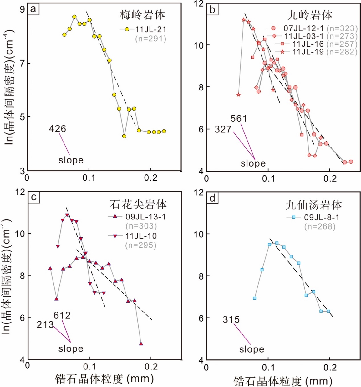 图1. 新元古代九岭岩体中锆石的晶体粒度分布(CSD)特征,以锆石晶体粒度间隔密度(n/VL)vs晶体粒度来表示。