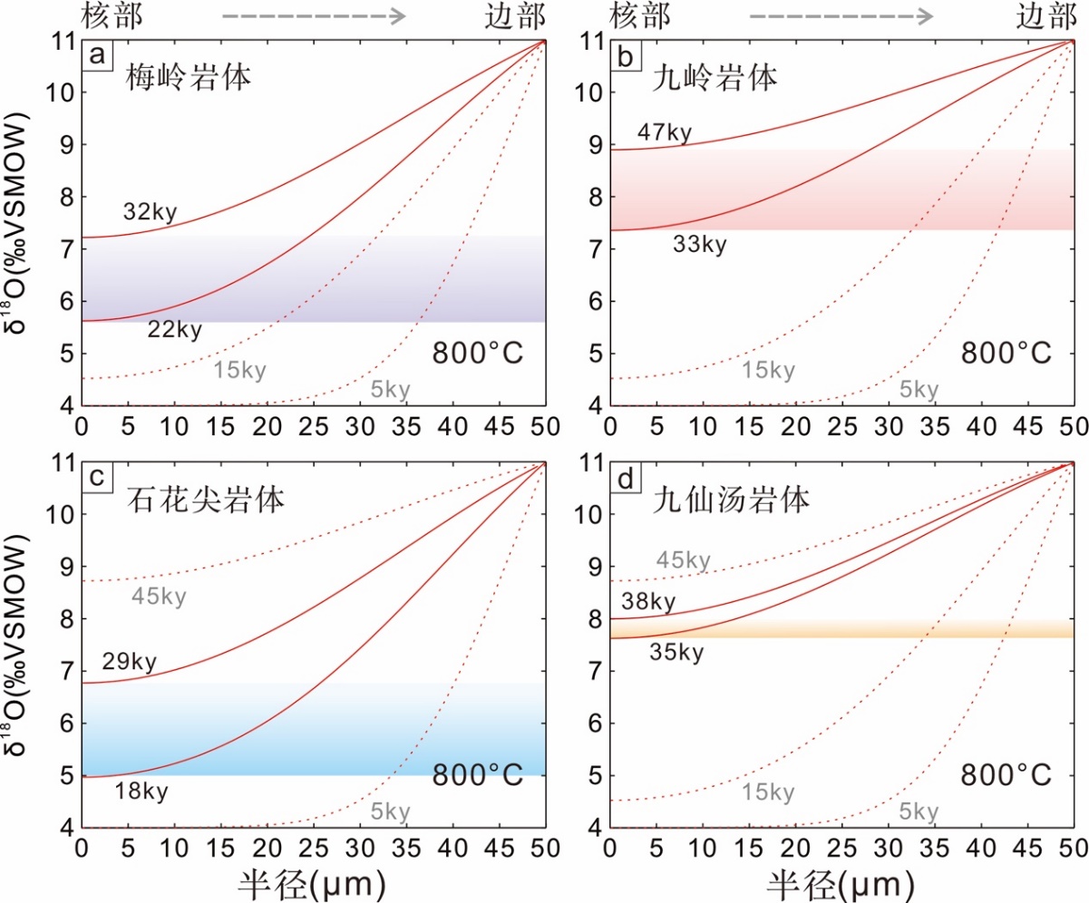 另外,研究者也发现,这些花岗岩岩浆锆石的边部和核部具有较大的氧同位素变化(其δ18O值在3.9‰–13.1‰之间)。假设这些氧同位素的变化完全是由于氧扩散而产生,根据扩散模拟的结果(图2)可限定各个岩体具有较短的岩浆存续时限(即梅岭岩体为2.2–3.2 万年,九岭岩体为3.3–4.7 万年,石花尖岩体为1.8–2.9 万年以及九仙汤岩体为3.5–3.8 万年)。考虑到这些锆石的氧同位素变化也有可能受到锆石的溶解和再结晶的影响,所计算得到的这些结果(1.8–4.7 万年)实际上提供了岩浆存续时限的最大值。