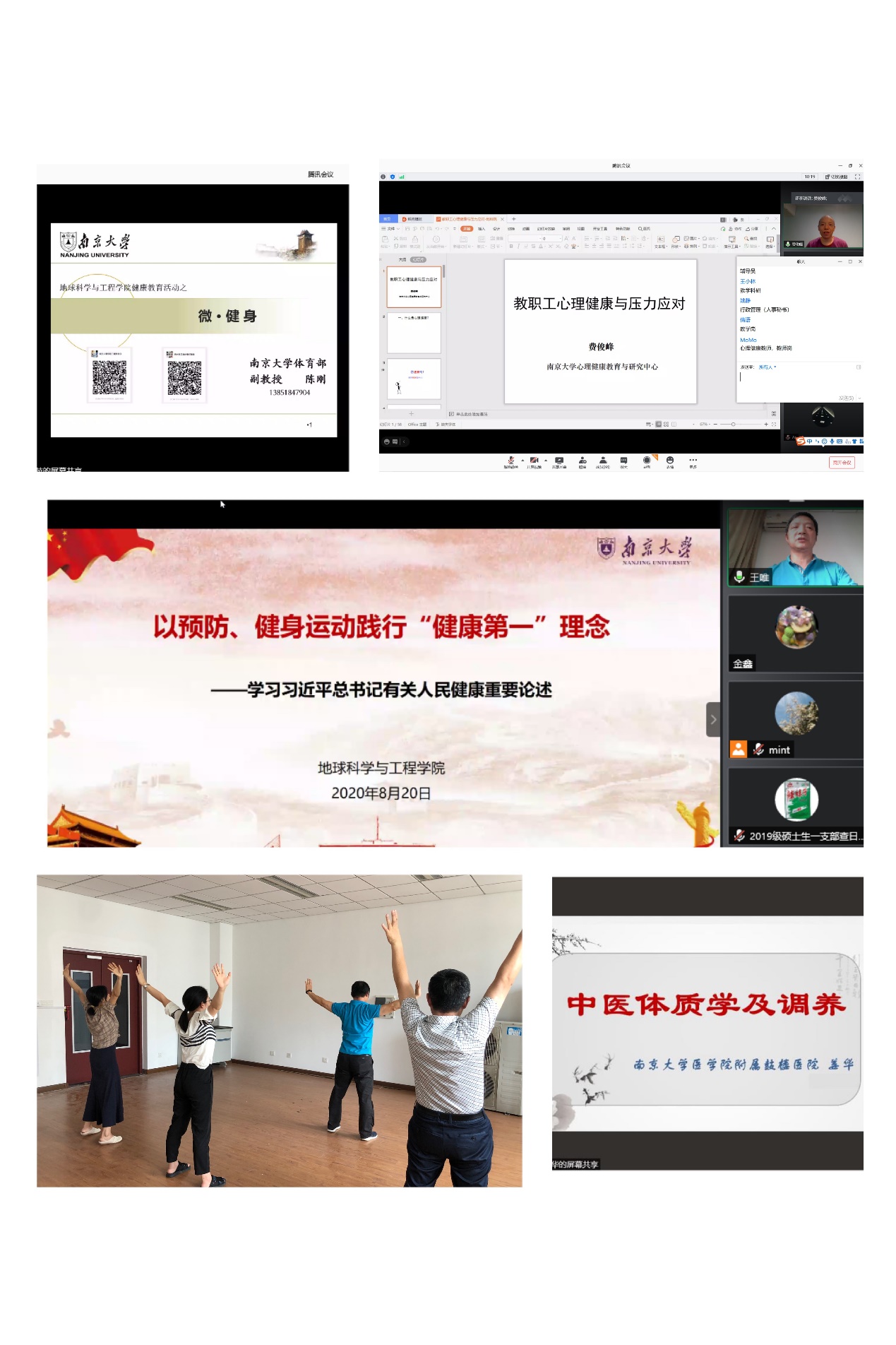 为践行习近平总书记“健康第一”的教育理念,关爱师生员工的身心健康,提高全院师生健康意识,学会科学健身方法,保持身心愉悦、积极向上的健康心态;为加强“双一流”建设,实现“第一个南大”奠定健康基础,地球科学与工程公司党建和业务培训中心、分工会共同举办地科院健康教育培训系列活动。本次活动于8月20日-28日期间开展,分别由公司党委书记王唯讲授微党课并开设武术站桩和健身气功八段锦培训,邀请校体育部陈刚副主任作题为《“微”健身》、校心理中心费俊峰主任作题为《高校教职工心理健康和压力应对》、bw必威西汉姆联官网医学院附属鼓楼医院中医内科姜华主任医师作题为《中医体质学及调养》的三场专题讲座,从运动健身、心理健康、身体调养等方面为学院师生打造一套全方位健康培训课程。