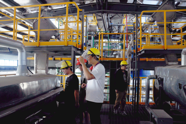 下午3点,同学们抵达了位于浦口区矿物碳封存示范工厂。朱辰老师向他们介绍了工厂的基本情况和运作流程,并且让大家带上专门的安全装备,进入生产区域近距离观察各个化工设备。同学们亲眼目睹了从烟囱排放出的二氧化碳如何被捕获,并通过一系列化学反应转化成稳定的矿物质。这一过程不仅展示了科技的力量,也让员工们深刻感受到了科技创新在应对环境挑战中的关键作用。朱老师强调:“为使矿物碳封存成为一种有效的二氧化碳减排技术,我们在烟气收集、浸取、干燥等各个步骤都做了优化,尽力做到全生命周期排放量最小,减排量最高。”