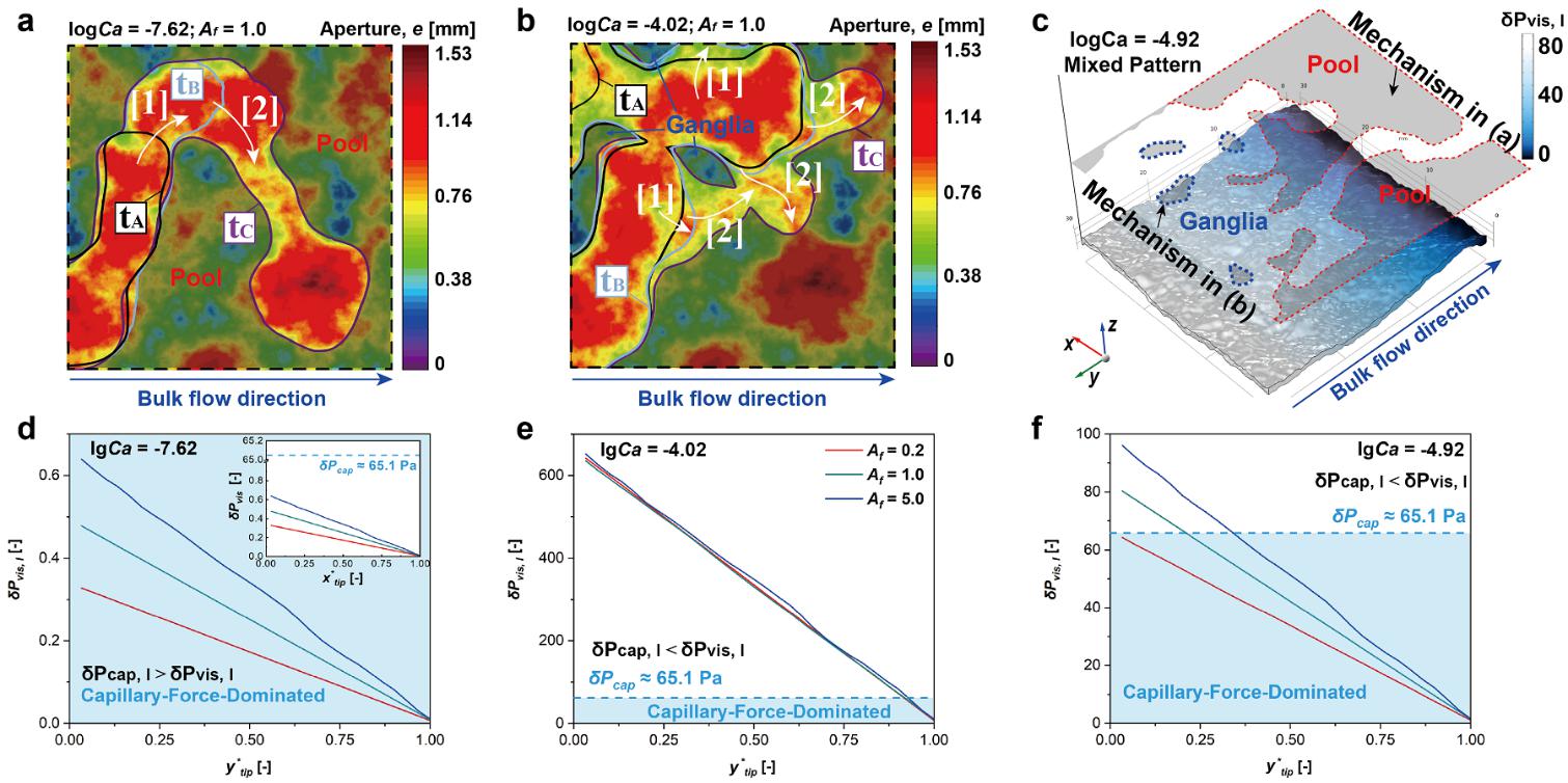图3 裂隙开度场异质性和流速耦合影响下的残留态NAPL源区结构形成机制。(a) NAPL在log10Ca = -7.62下的残留过程。背景配色表示开度场场;线条轮廓代表驱替过程中的水指;黑色轮廓表示图(a)和(b)中的时间tA,蓝色轮廓表示时间tB,紫色轮廓表示时间tC;局部孔隙填充事件[1]和[2]分别表示从tA到tB和从tB到tC水指驱替NAPL的行为。(b) NAPL在log10Ca = -4.02下的残留过程。(c) 数值模拟中等水流流速下的粘性压力场(log10Ca = -4.92)。(d) 在低流速(log10Ca = -7.62)、(e)高流速(log10Ca = -4.02)和(f)中间流速(log10Ca = -4.92)条件下,水驱替NAPL过程中局部粘性压降(δPvis, l)的变化。