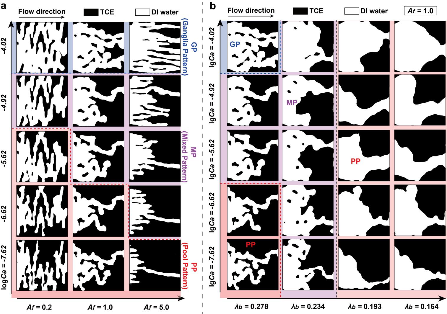 图2. 粗糙单裂隙中的残余NAPL源区结构。(a) 第一组裂隙(具有不同开度场各向异性(Af)、相同平均开度(ea = 0.79 mm)和粗糙度(λb = 0.278)的裂隙)在不同流速(Ca)下的实验结果,以及(b)第二组裂隙(裂隙粗糙度不同(λb)、相同开度场各向同性(Af = 1.0))在不同流速下的实验结果