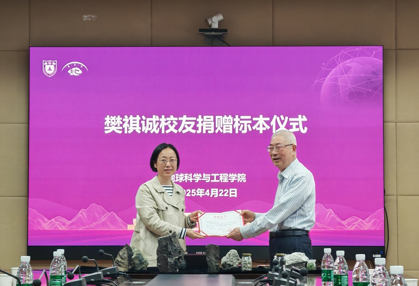 董婷书记代表学院向樊祺诚研究员颁发感谢状,感谢他为母院捐赠的珍贵火山岩标本。本次捐赠恰逢第56个世界地球日,是推动学业地质学实验教学和科研创新的重要实践,是给母校最好的献礼,体现了员工对母院发展的关心和支持。