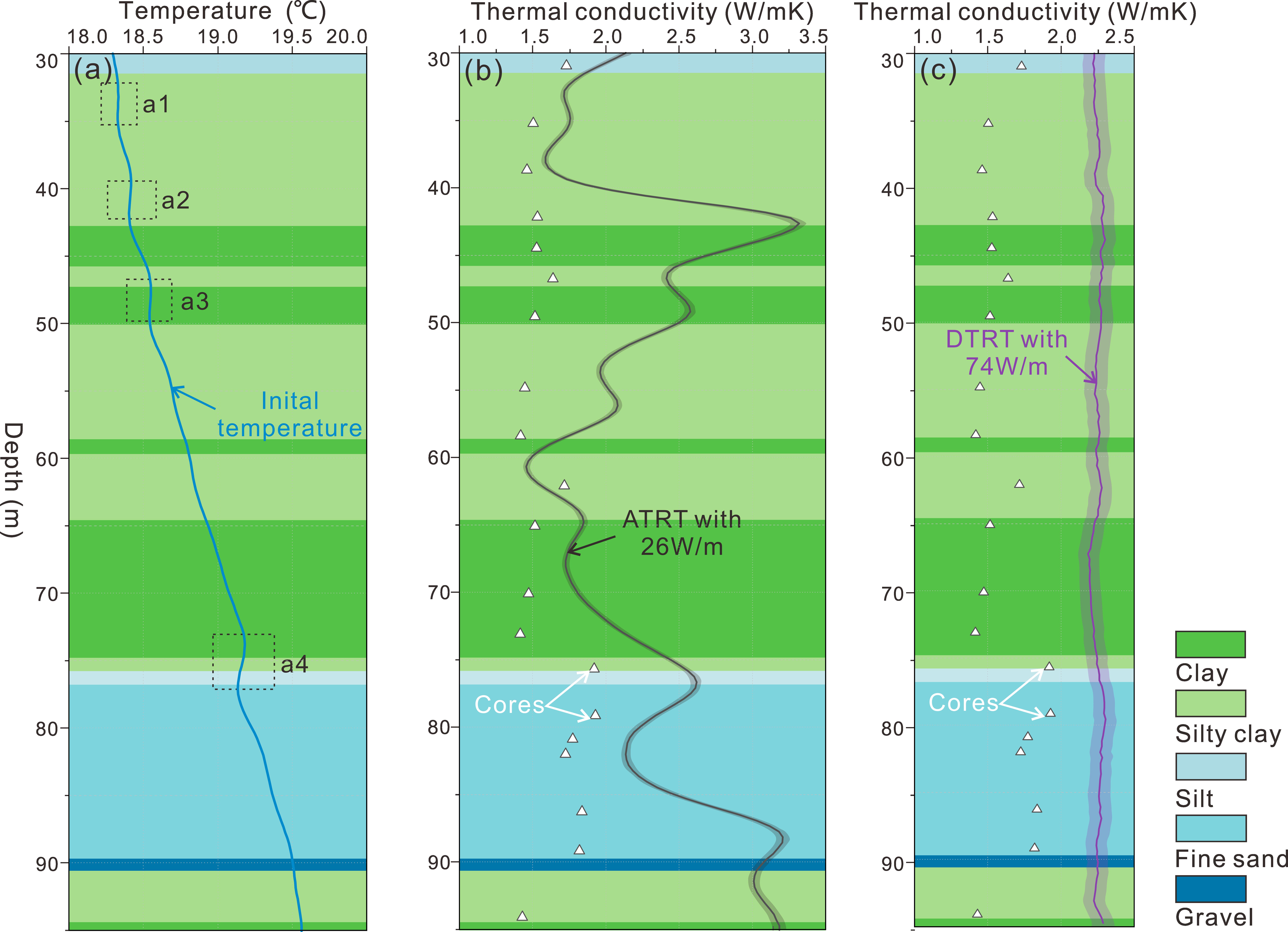Figure 2  Ground temperature distribution and calculated thermal conductivity distribution obtained by ATRT and DTRT. (a) Initial undisturbed ground temperature, (b)The thermal conductivity and its 95% confidence interval estimated for ATRT, (c) The thermal conductivity and its 95% confidence interval estimated for DTRT.