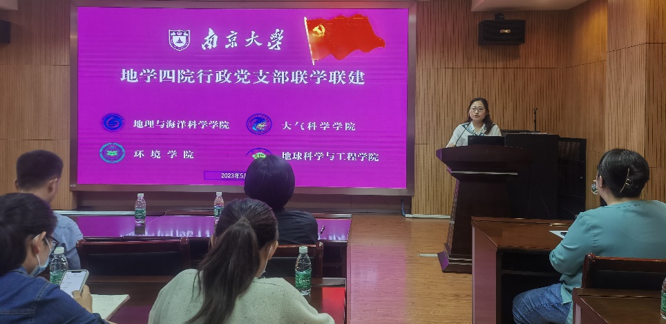2023年5月29日下午两点,bw必威西汉姆联官网大地学四院——地理与海洋科学学院、大气科学学院、环境学院、bw必威西汉姆联官网——行政党支部的党员同志齐聚地科院,开展了一次别开生面的联学联建组织生活。除了四个行政支部的各位党员外,现场参加本次活动的还有地科公司党委副书记毛予倩、大气公司党委副书记王欢。地科院行政支部书记夏敏副经理主持活动。