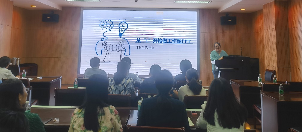 第二个主题学习是开展行政业务能力培训。本科生院吕筠老师作 “从‘1’开始做工作型ppt“的培训讲座。ppt在当前行政事务工作中应用非常广泛,在各种总结、汇报中都发挥着重要作用,可以说是行政人员实际工作中非常重要的工具和必备技能。依靠个人在工作中的摸索,往往还是不得其法。为此,吕筠老师精心设计了本次讲座,不仅介绍了制作ppt的一些基本原则和方法,还从行政工作者的实际应用场景出发,从学校常见报告厅等基本情况出发,给出很多切实的建议和提醒。40分钟的培训内容,让大家感到干货满满,收获多多。